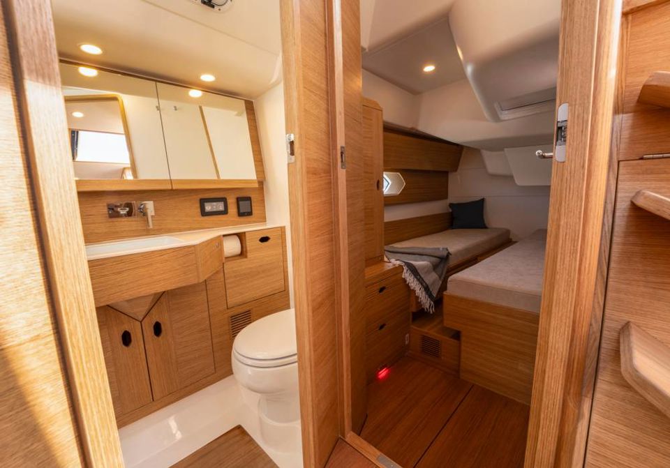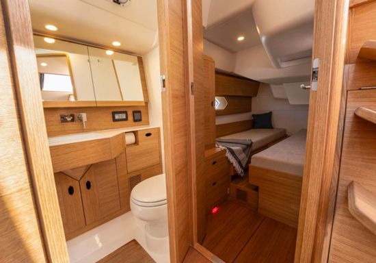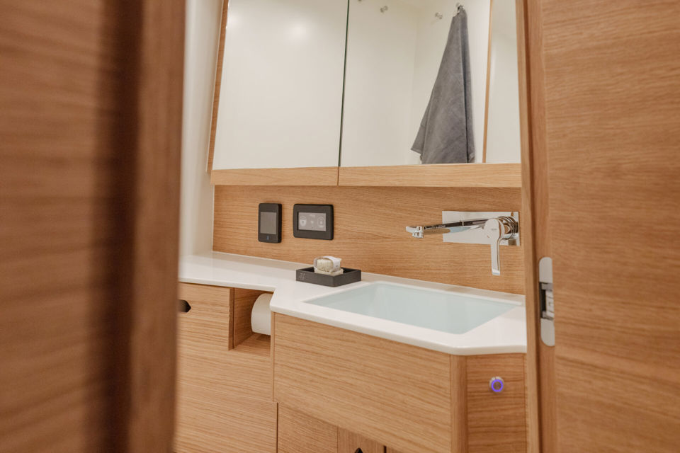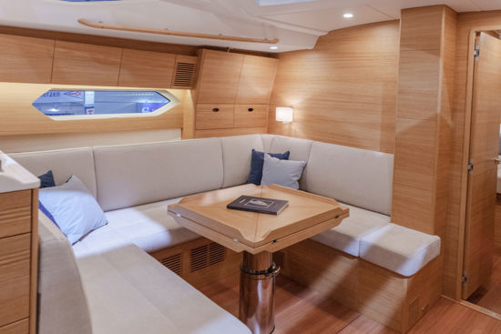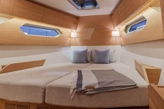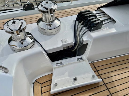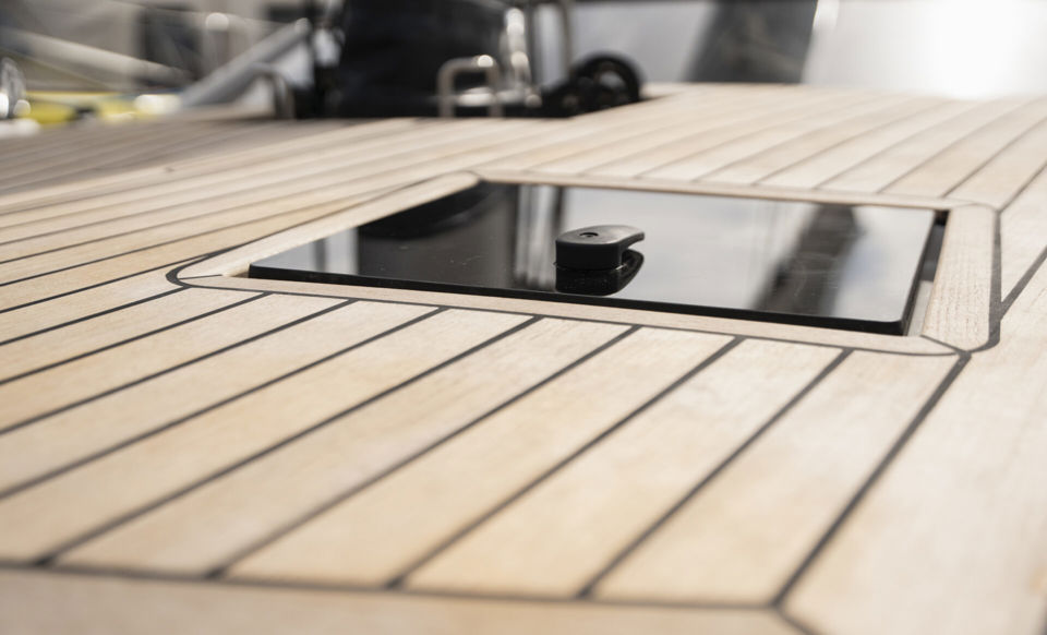 Every detail has been optimized for ease and style. The cockpit layout puts all lines within reach of the helmsman, with four strategically positioned winches and all trim lines led under deck with reachable jammers. The traveller is relocated forward of the sprayhood, creating a spacious, functional cockpit while leaving room for a comfortable living area. A deep, protected cockpit with a closed transom features a full-width aft seating area and sunbathing space – perfect for offshore comfort.